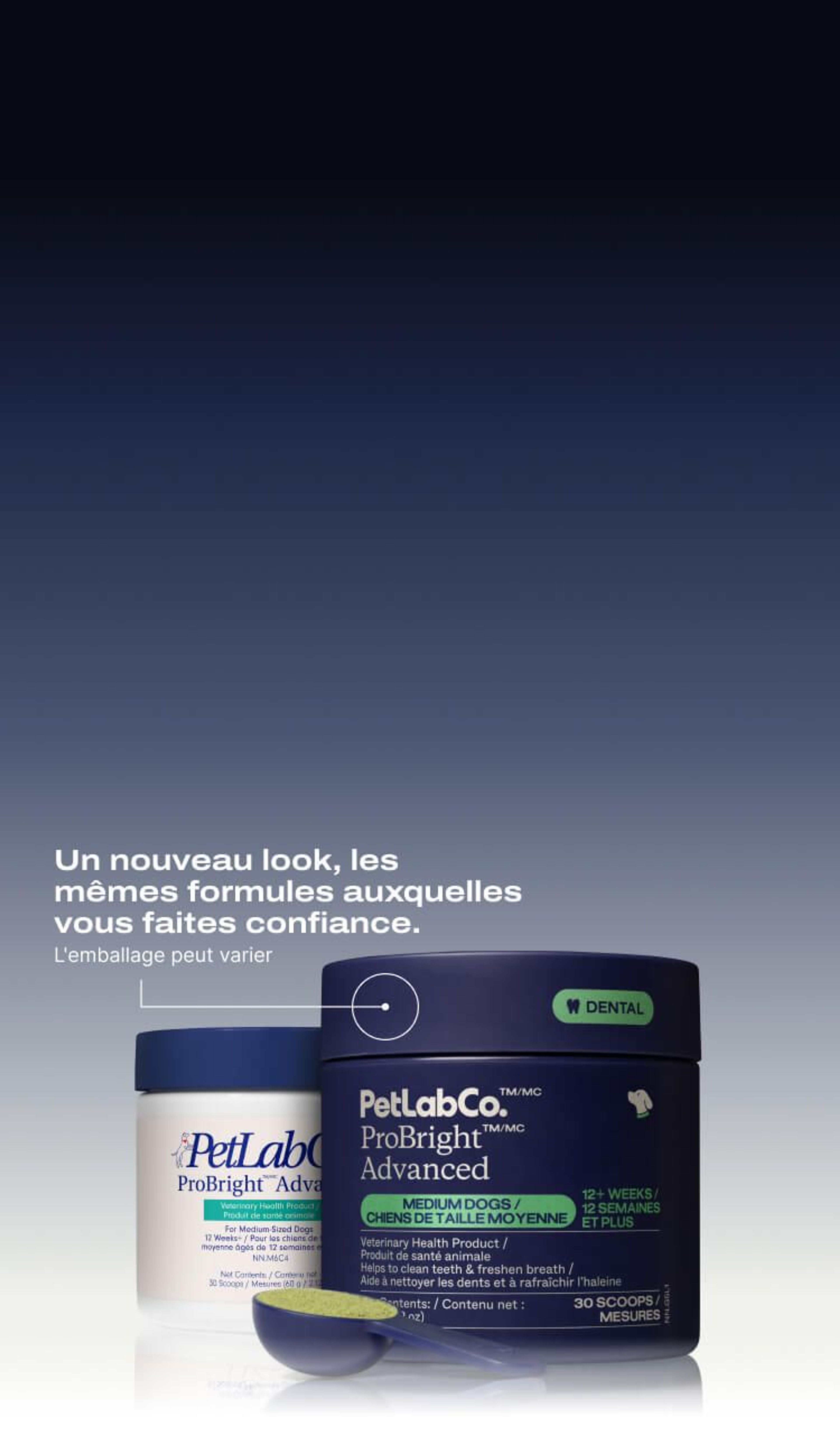 Découvrez le probiotique pour chiens le plus vendu aux Canada, une bouchée qui favorise la digestion et offre un soutien durant les changements saisonniers. Ou essayez ProBright® Advanced, notre poudre nettoyante pour les dents pour une haleine fraîche et des dents propres.